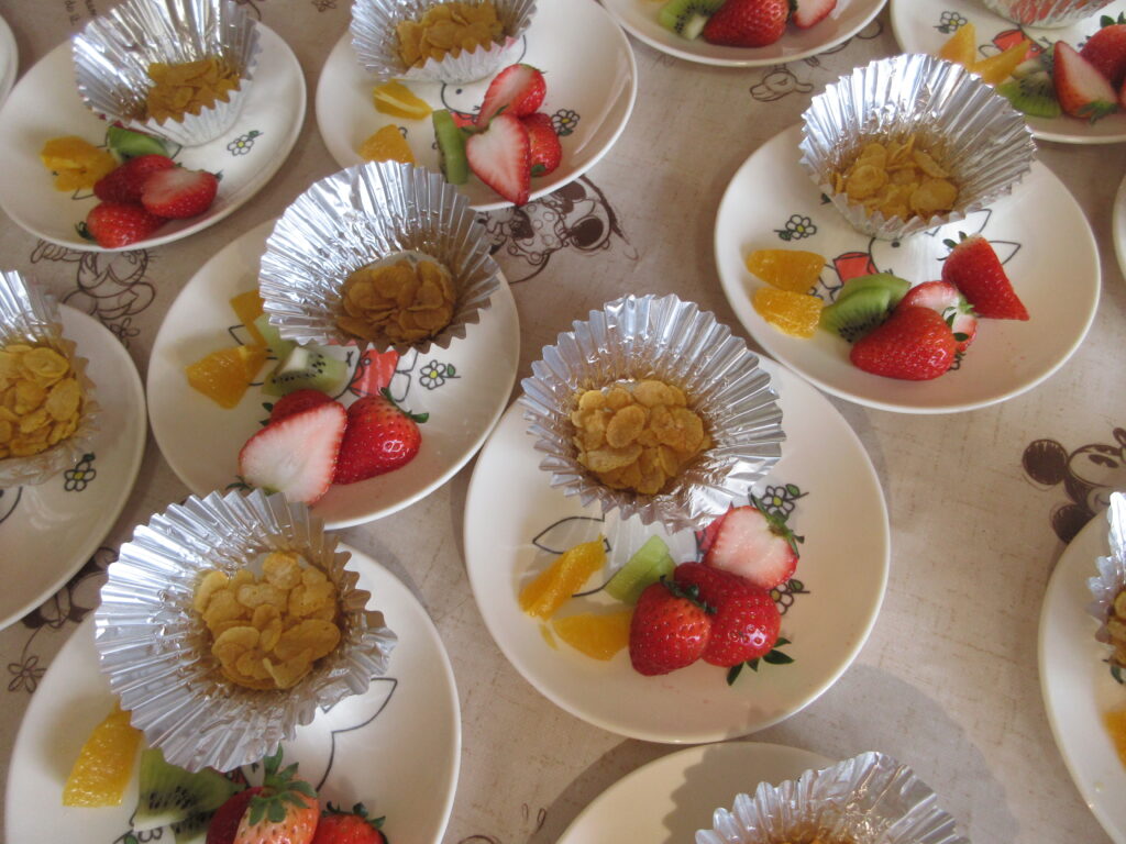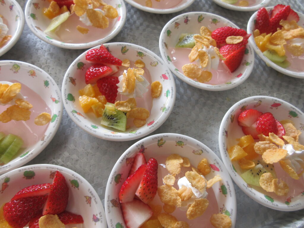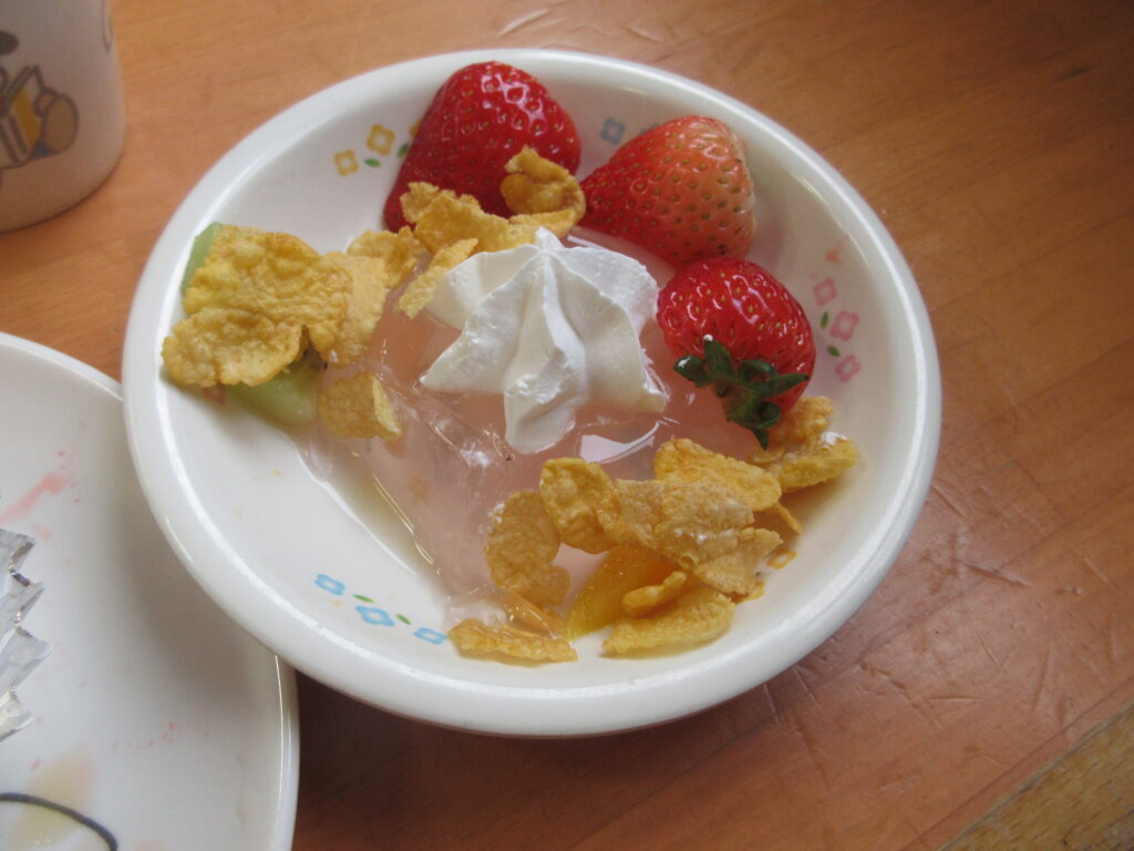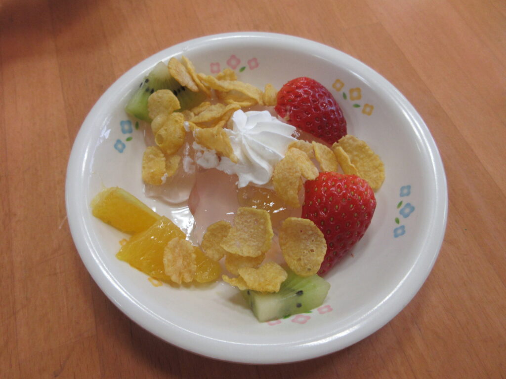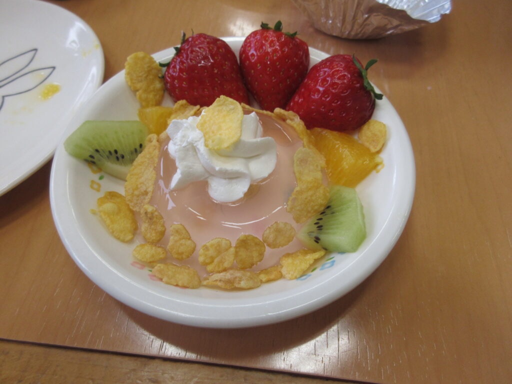 いちご、オレンジ、キウイ、コーンフレークを自分でトッピングし、自分だけのお祝いゼリーを作りましたよ(^-^)