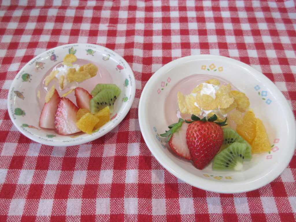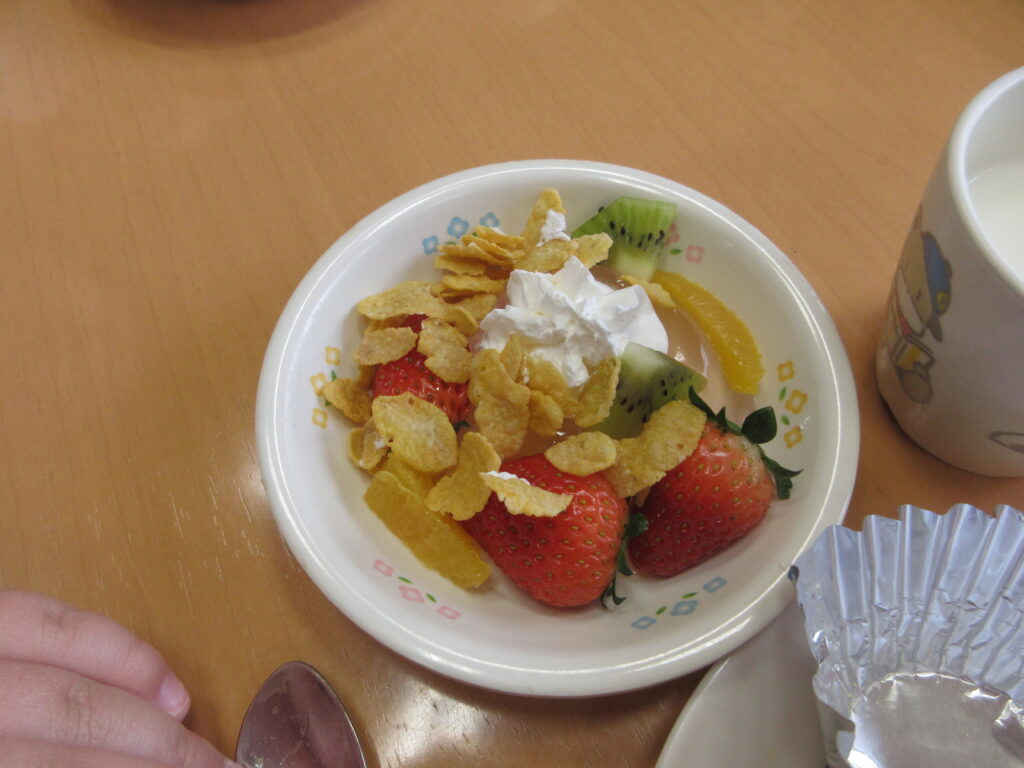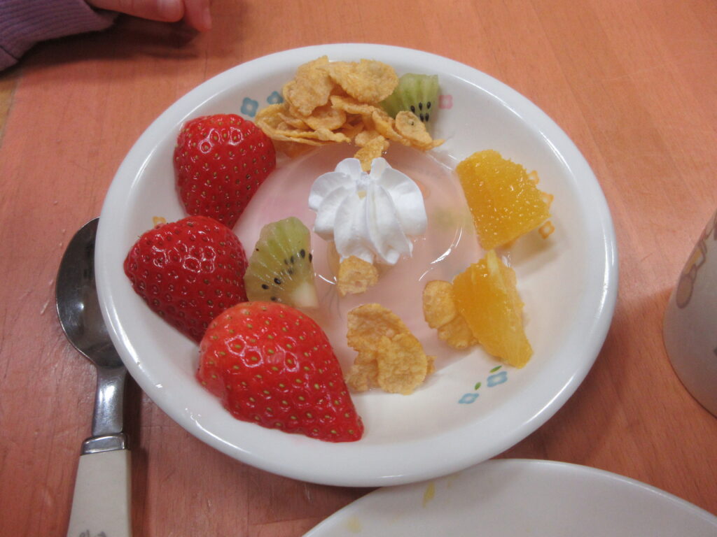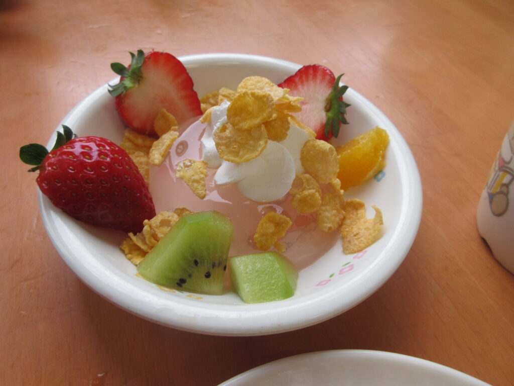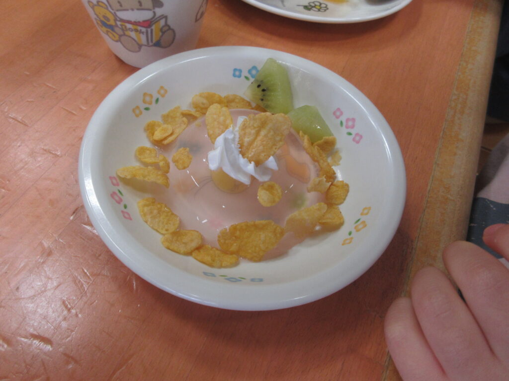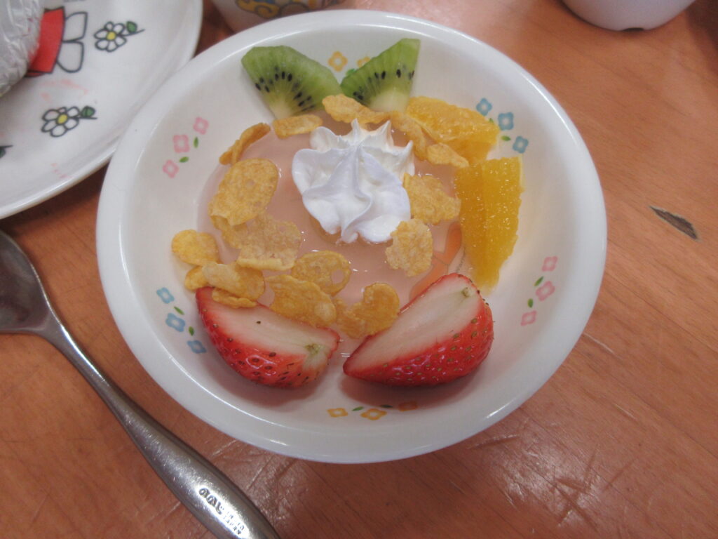 いちご、オレンジ、キウイ、コーンフレークを自分でトッピングし、自分だけのお祝いゼリーを作りましたよ(^-^)