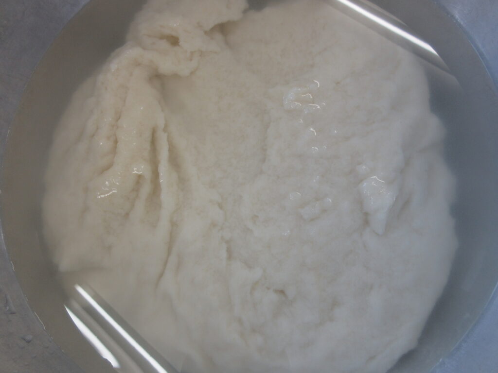 蒸したもち米を、臼と杵を使ってついたおもちがこちらです。「よいしょ、よいしょ」のかけ声が、給食室にも聞こえてきていました。お手伝いしてくださったおじいちゃんたち、ゆり組さん、あいどりをした保育士たちがみんなで協力してついたおもちは、とってもなめらかで、とってもきれいなおもちでした✨