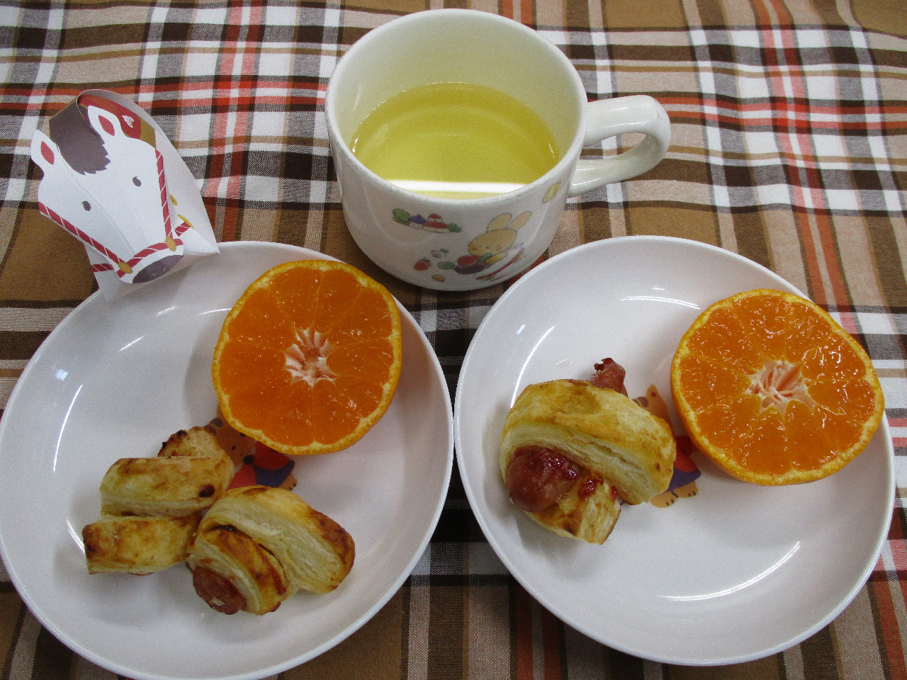 おやつはウインナーにケチャップを塗ったパイシートをくるくると巻いて、オーブンで焼いたウインナーパイ♪サクサクのパイにジューシーなウインナーがよく合い、子ども達好みに仕上がりました!「美味しい!」「おかわりある~?」と嬉しい声が聞こえてきました!