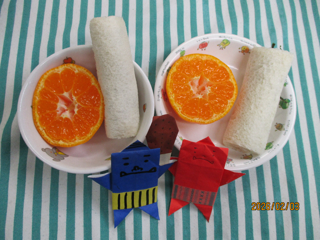 給食を作っていると子どもたちの「鬼は外~!福はうち~!」の元気な声が給食室まで聞こえてきました!元気に厄を払い、「お腹減った~」とたくさん給食を食べてくれました♪
